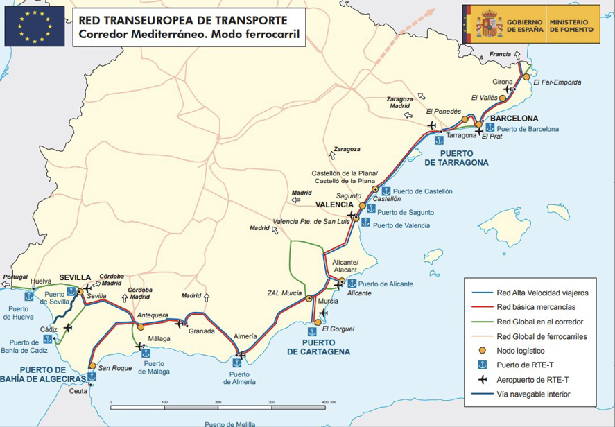 Con casi total seguridad, uno de los elementos que mejor permiten comprender y demostrar la vinculación entre el desarrollo de la RTE-T y la optimización de la red de infraestructuras de Andalucía y de la profundización del eje territorial Sevilla-Málaga es la creación y expansión del conocido Corredor del Mediterráneo de mercancías por ferrocarril, que comienza en la capital andaluza, se dirige hacia Antequera y Almería, y a partir de ahí asciende por todo el arco mediterráneo, desde Murcia hasta la Comunidad Valenciana, llegando hasta Cataluña y adentrándose en territorio francés por Perpiñán y Lyon, hasta su llegada final a Rumania, recorriendo gran parte del sudeste de Europa (Ministerio de Fomento del Gobierno de España, 2019).