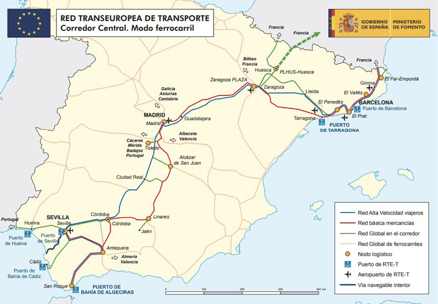 En cuanto a las figuras 3d y 3e (que se refieren todos a ellos a corredores específicos), el Corredor central y el tendido ferroviario, uno de los aspectos más importantes es la creciente relevancia de dos de los nodos logísticos de nuestro eje territorial principal de estudio (Sevilla-Málaga), Antequera y Sevilla, para comunicar la capital de España con la capital catalana y Francia, alcanzando un grado alto de intermodalidad e interoperabilidad mediante la red de Alta Velocidad para viajeros, la red básica de transporte de mercancías, la red global en el corredor, la red global de ferrocarriles y la infraestructura de puertos, vías navegables interiores y aeropuertos. El proyecto de desarrollo de conexión entre los corredores atlántico y mediterráneo supone la optimización de las redes de transporte de mercancía por carretera, ferrocarril y del principal puerto español (Valencia). Este eje conecta Castilla-La Mancha con Extremadura y el Levante español, teniendo como punto central la capital española, desde el cual se establece una bifurcación entre Galicia-Asturias-Cantabria-País Vasco-Francia y Zaragoza-Barcelona-Francia.