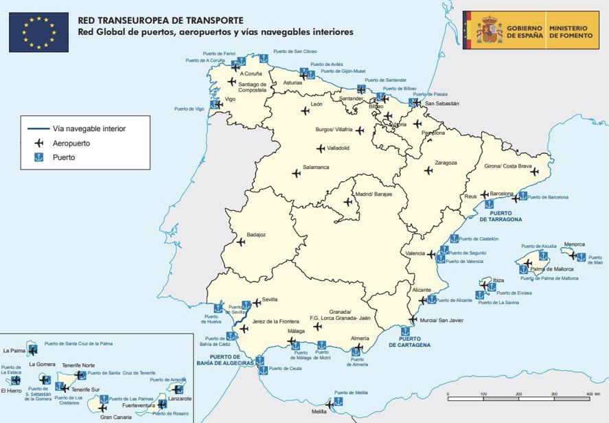 Figura 3g. Red transeuropea de transportes. Red Global de puertos, aeropuertos y vías navegables interiores. Fuente: Ministerio de Transportes, Movilidad y Agenda Urbana del Gobierno de España (2022).