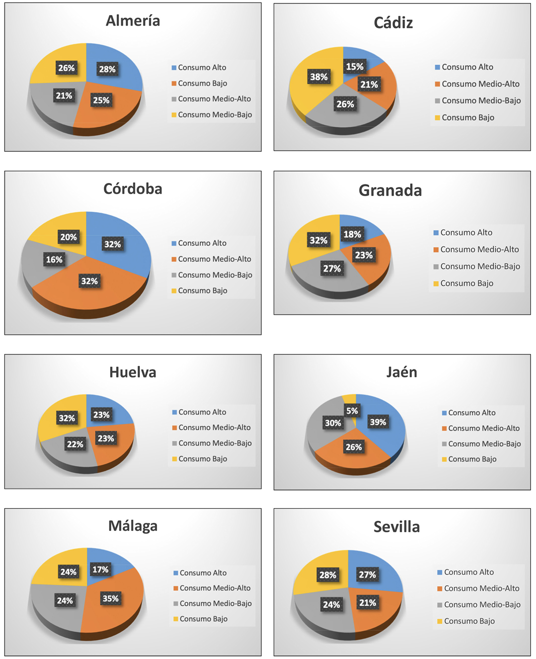 En el estudio del consumo de energía eléctrica por sectores, se concluyó que en las provincias de Huelva y Cádiz el sector que más destaca es la Industria, mientras que en el resto de provincias destaca el sector residencial. Esto supone importantes diferencias entre las dos primeras provincias y las restantes y puede servir de guía para poder proponer medidas de ahorro en el consumo de energía eléctrica en dichos sectores.