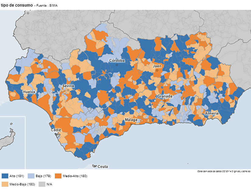 El análisis estadístico descriptivo reveló que el municipio que mayor consumo medio por habitante registra es El Granado (Huelva). Se trata de un municipio de tan solo 532 habitantes, una extensión bastante grande y cuenta con la central hidroeléctrica y embalse del Chanza. El hecho de que un municipio de Huelva sea el de mayor consumo por habitante concuerda con el estudio realizado sobre las medias provinciales donde se vio que la provincia de Huelva es la que tiene mayor media de consumo. Esta situación es común a otros municipios como Cantoria y Carboneras (Almería), Los Barrios y San Roque (Cádiz), Espiel (Córdoba), Zújar (Granada), Mengíbar (Jaen), Benahavís (Málaga) y Gerena (Sevilla). En todos ellos hay un escaso volumen poblacional y la presencia de polígonos industriales, centrales térmicas o minas.