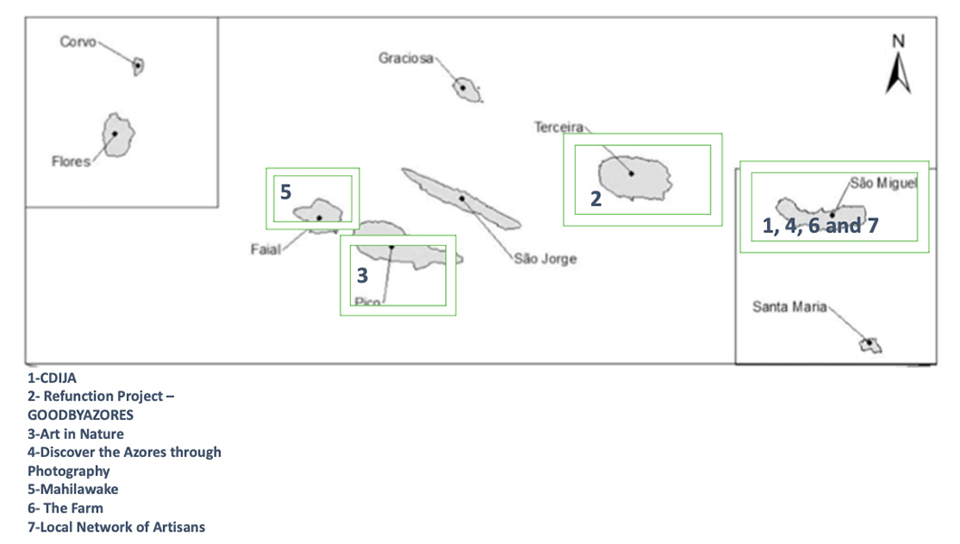 The analysis includes seven pilot-projects of creative tourism working in the Portuguese Autonomous Region of the Azores. The assessed projects were: (1) CDIJA; (2) Refunction Project – GOODBYAZORES; (3) Art in Nature (Arte na Natureza); (4) Discover the Azores through Photography (Descubra os Açores através da fotografia); (5) Mahilawake; (6) The Farm; and (7) Local Network of Artisans. Regarding their location, the case studies are located on 4 of the 9 Azorean islands. So, four are located on S. Miguel Island – namely CDIJA, Art in Nature projects, The Farm, and Local Network of Artisans; one on Terceira Island (Refunction Project – GOODBYAZORES); and another one on Faial Island (Mahilawake) (figure 1).
