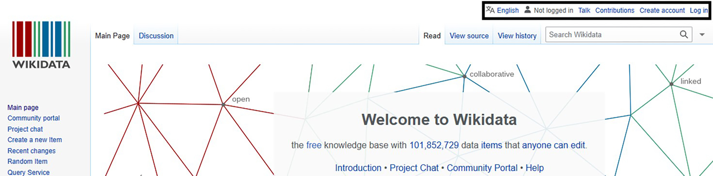 Figura 1. Plataforma Wikidata y área de acceso de editores. Fuente: Wikidata (2023).