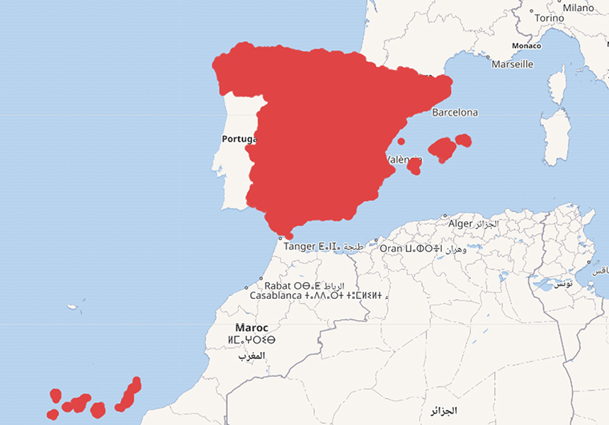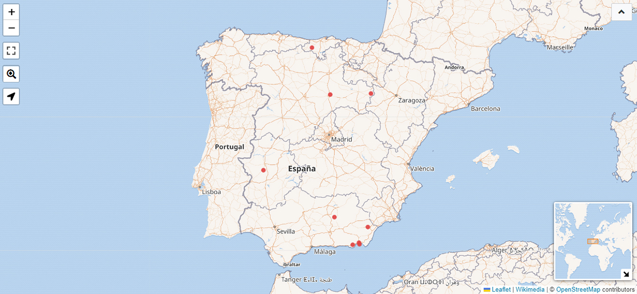 Figura 11. Mapa obtenido con Wikidata Query Service que muestra un punto por cada vértice geodésico introducido. Fuente: Elaboración propia (2023).