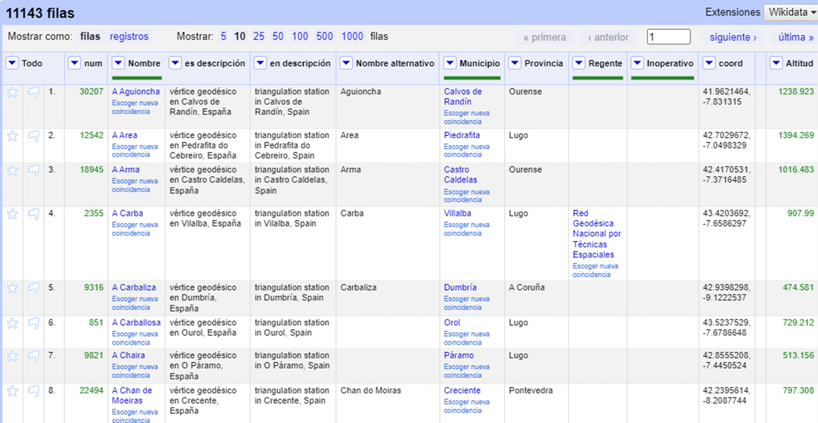 (En la siguiente dirección se puede visualizar la consulta en Wikidata Query Service: https://w.wiki/69yR). Después se comprobó que los valores numéricos no contenían errores en los datos, como valores extremos. También, se realizó la comprobación de que todos los vértices se localizaban dentro del territorio nacional. Igualmente, se buscaron los 16 vértices que aparecían en la fuente 1, pero no en la fuente 2, ya que éstos no podían tener la misma referencia, al no disponer del enlace URL que se obtuvo de la página web.