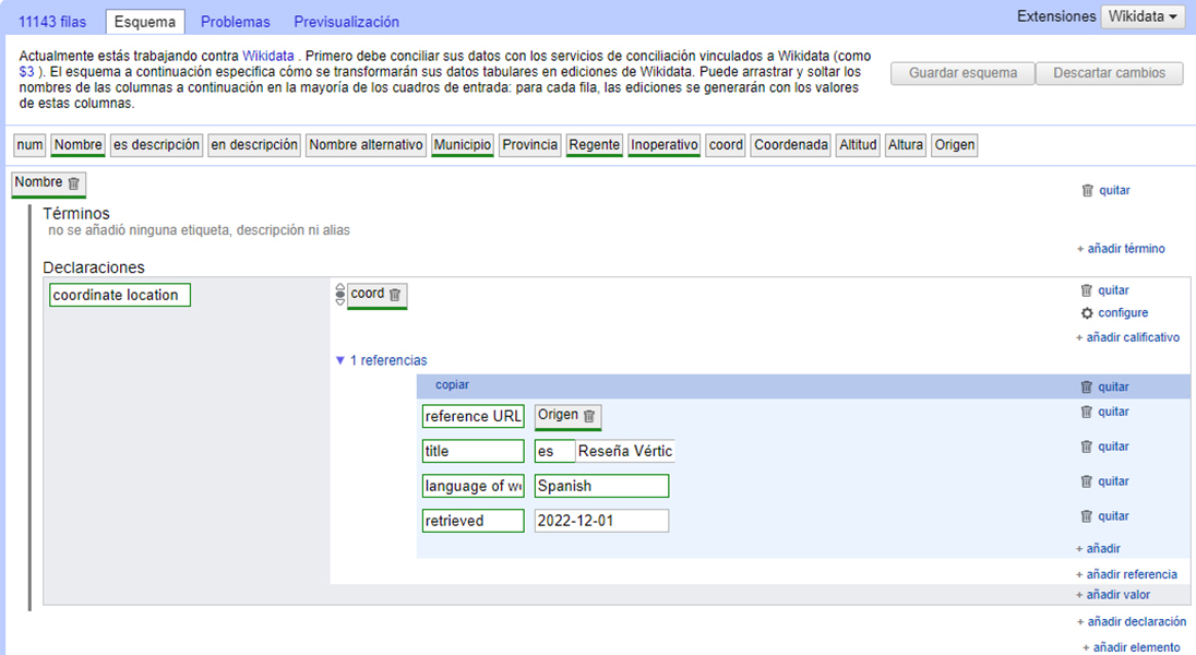 A continuación, siguiendo la metodología descrita para esta fase se ha procedido a crear un esquema, esto es, una plantilla de ediciones de Wikidata que se aplica a cada fila que se va a insertar. Tras pulsar el enlace “añadir elemento” se comprobó que la columna vértice ya había sido cotejada, (había 12 creados y el resto fueron nuevos). A continuación, se introdujeron los términos y declaraciones. En los términos se añadió la etiqueta, descripciones y alias, mientras que en las declaraciones el resto de columnas que se muestran en la tabla 4.