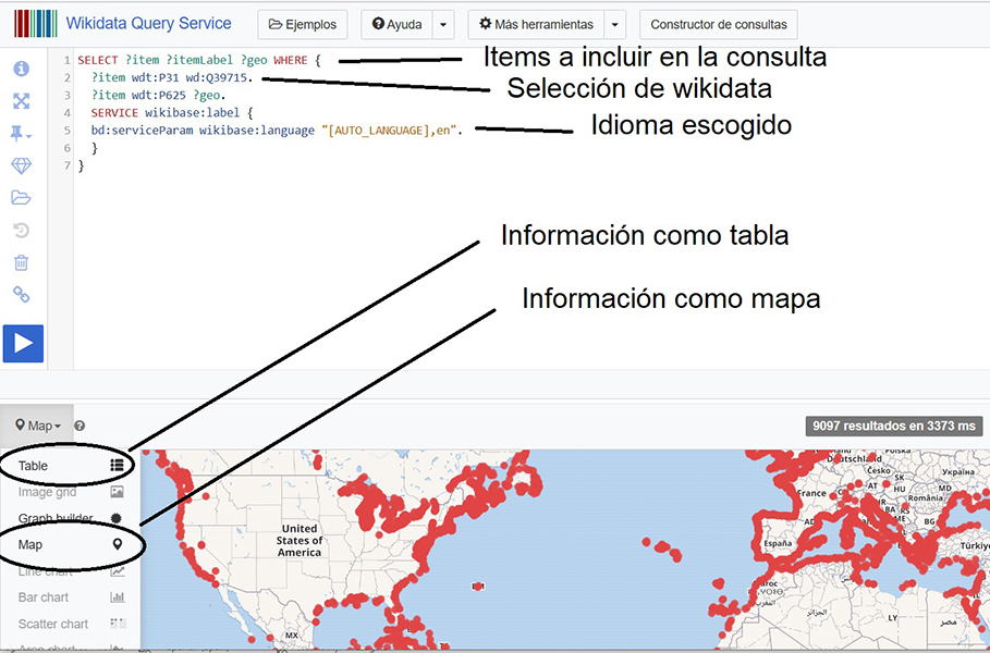 Una vez que se ha tomado en consideración todo lo anterior, se inicia una consulta en Wikidata para comprobar la existencia de la información geográfica a subir, a fin de no generar duplicados y garantizar que no se había realizado previamente el trabajo. Dicha consulta se puede realizar desde Wikidata Query Service (https://query.wikidata.org/), esto es, el servicio de consultas de la base de conocimiento que emplea el lenguaje de consultas denominado SPARQL, un lenguaje estandarizado similar a SQL, aunque adaptado a la consulta de grafos RDF (Resource Description Framework).