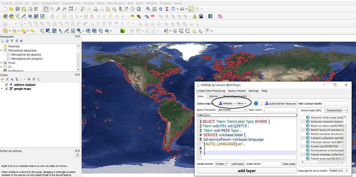 Esta importación de datos de Wikidata se realiza seleccionando “Wikidata” como “endpoint” e incluyendo el texto de la consulta de la herramienta Wikidata Query Service, tras su ejecución se podrá disponer de datos en la aplicación QGIS. Sin embargo, para poder realizar las consultas correctamente es imprescindible que los nombres de los campos se adapten a lo que entiende SPARQLing, como las coordenadas (geo) y el elemento (item). La denominación del resto de campos es libre. Por otra parte, esta conexión directa con un repositorio público como Wikidata es posible toda vez que QGIS es un software de código abierto, por lo que son abundantes los accesos a servidores de acceso público. Asimismo, aunque no existe una herramienta de conexión directa entre Wikidata y ARCGIS siempre es posible exportar los datos en el formato csv desde Wikidata Query Service y añadir la información espacial a ArcGIS según dicho formato.