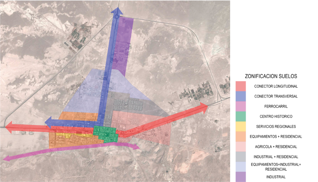 Otro elemento que se reconoce como tendencia en el crecimiento del asentamiento es un Horizonte Longitudinal de Servicio, dirigido a fortalecer el centro histórico de Pozo Almonte y actuar como un área de transferencia de flujos en dirección Norte-Sur, proporcionando servicios a turistas y usuarios en movimiento. En esta área se podría consolidar la ocupación residencial mixta y las zonas de servicios (figura 6).