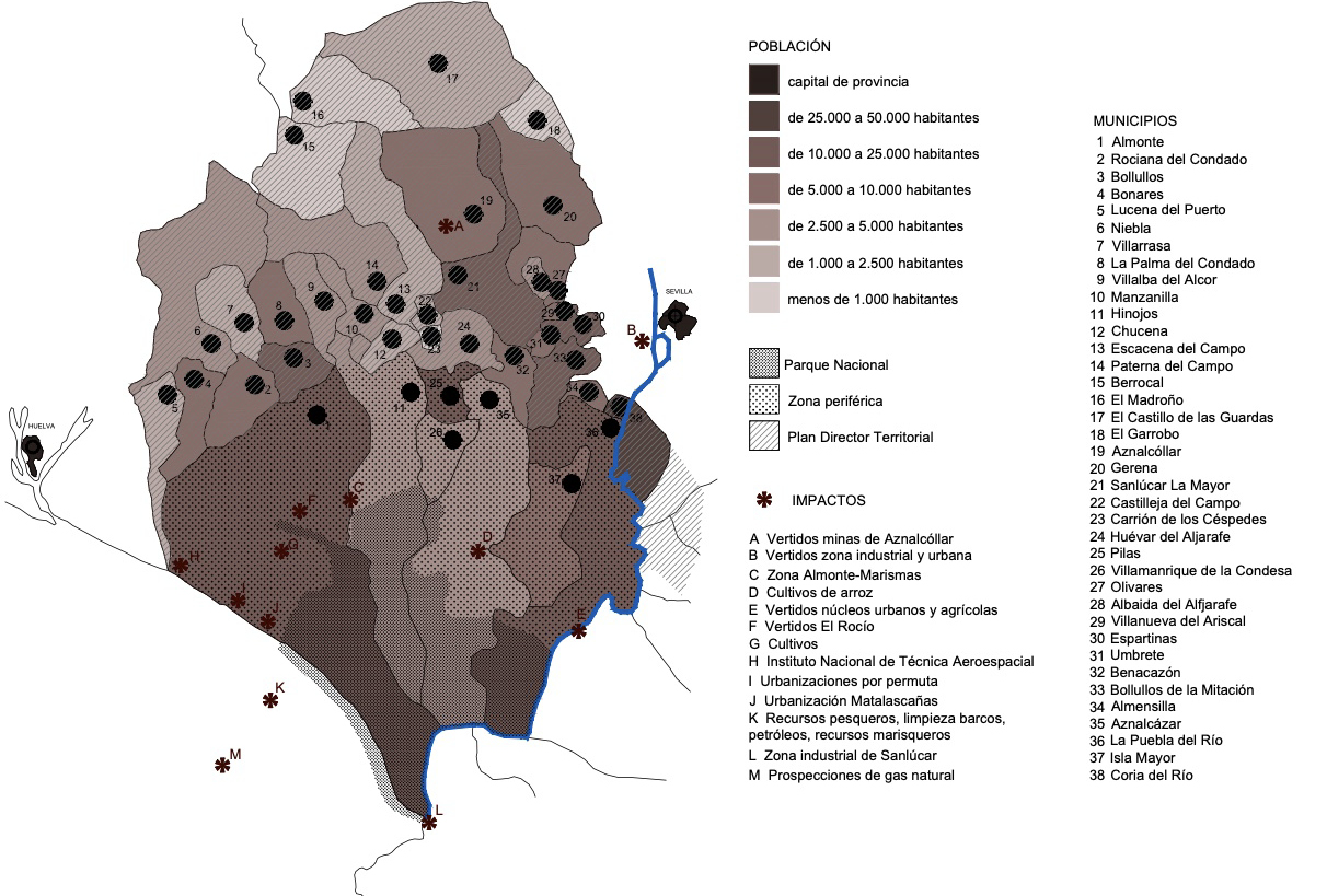 Mapa 1. Impactos en Doñana y su entorno. Fuente: elaboración propia a partir de Ojeda, 1987, p. 7.