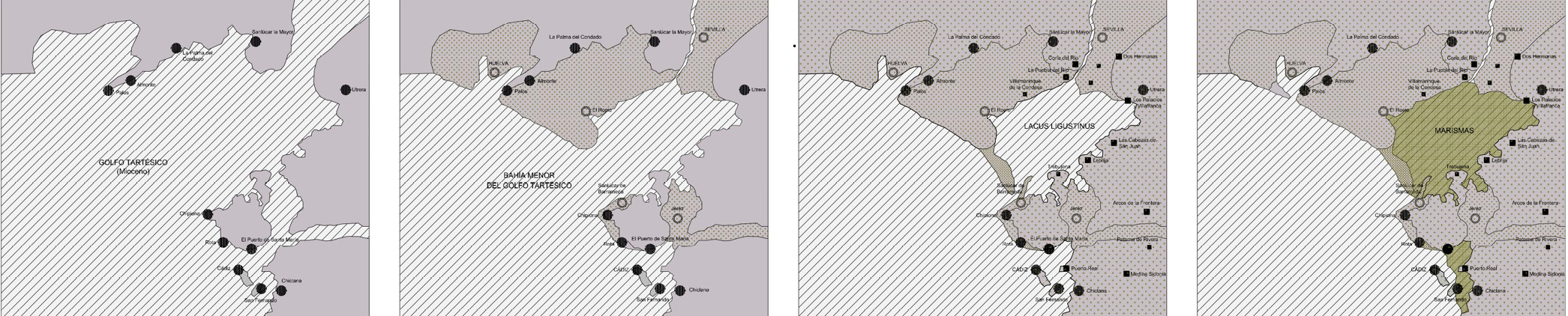 Mapa 2. Evolución territorial del estuario del Guadalquivir. Fuente: elaboración propia a partir de Gavala y Laborde, 1936.
