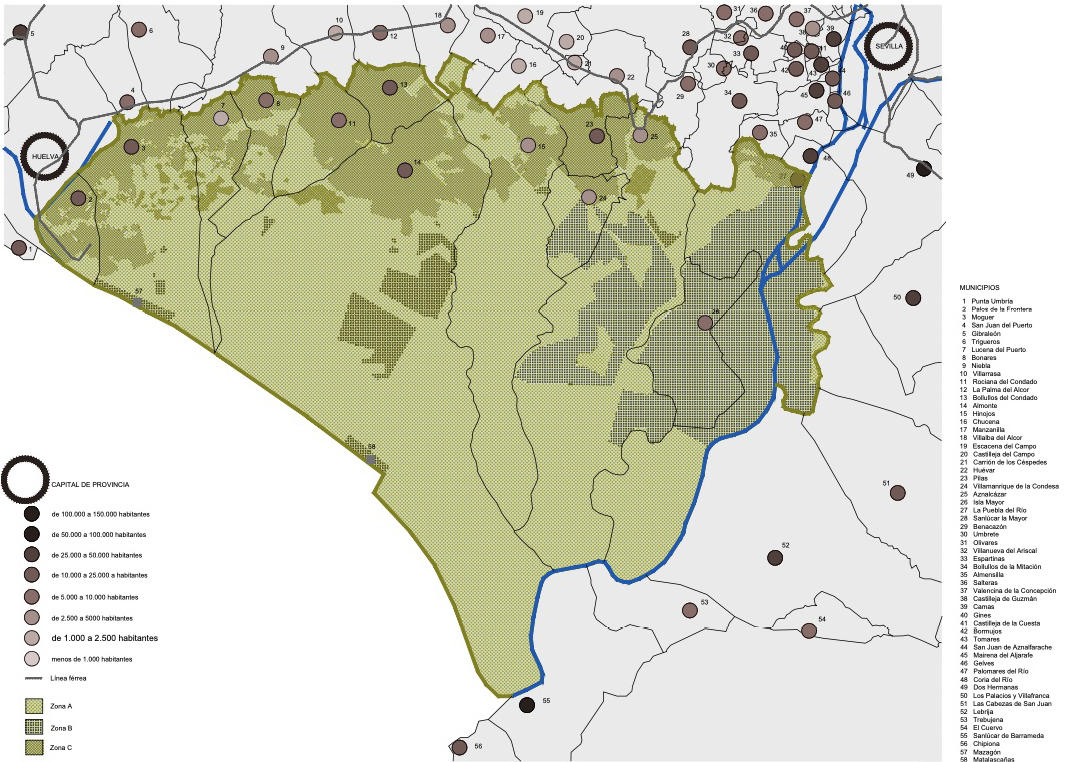[6] Los municipios que, a fecha de publicación del Plan de Ordenación del Territorio del Ámbito de Doñana (COPT, 2003), conforman el ámbito son los siguientes: Almonte, Aznalcázar, Bollullos Par del Condado, Bonares, El Rocío, Hinojos, Isla Mayor, La Palma del Condado, La Puebla del Río, La Rábida, Lucena del Puerto, Matalascañas, Mazagón, Moguer, Palos de la Frontera, Pilas, Rociana del Condado y Villamanrique de la Condesa.