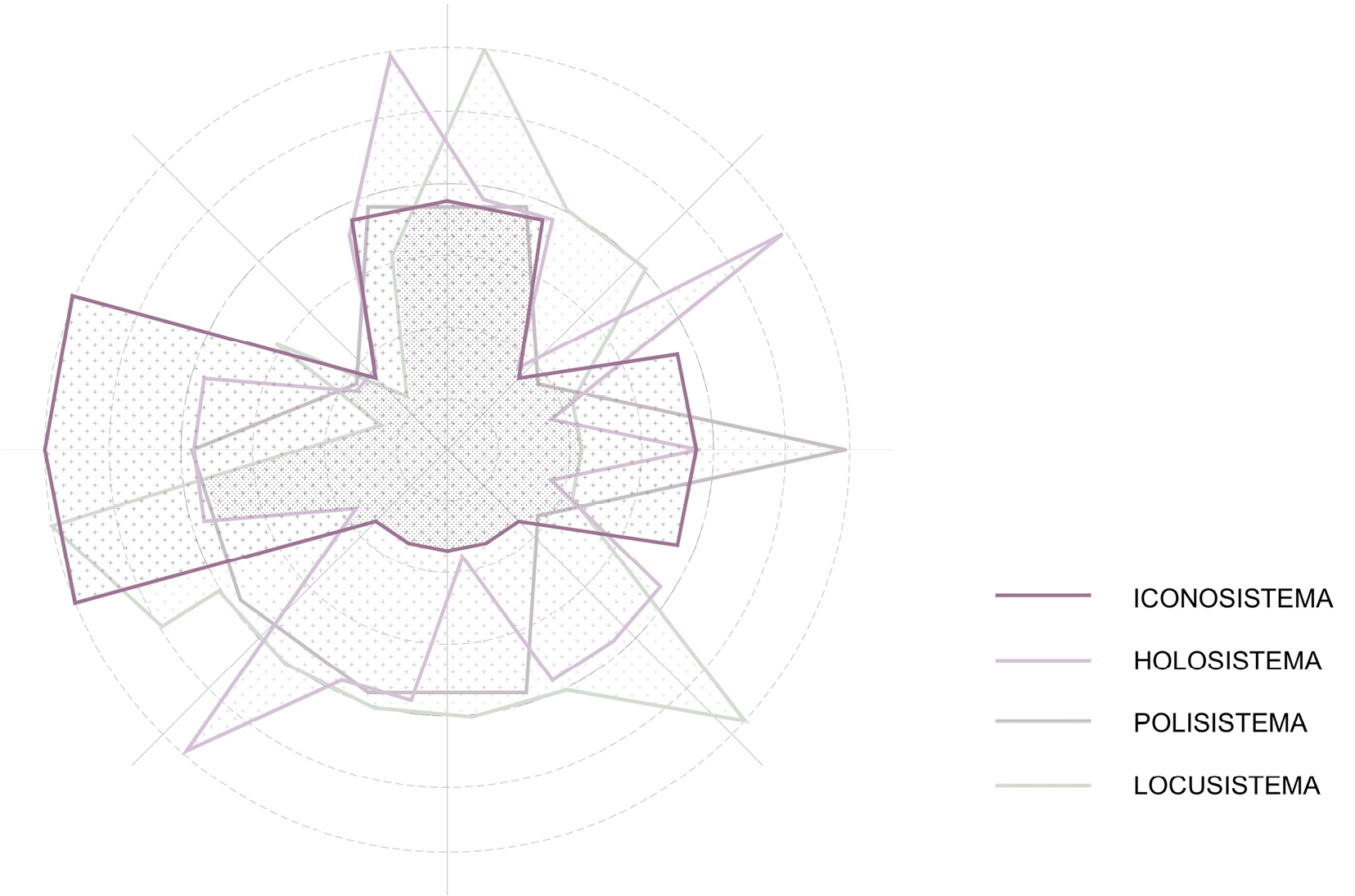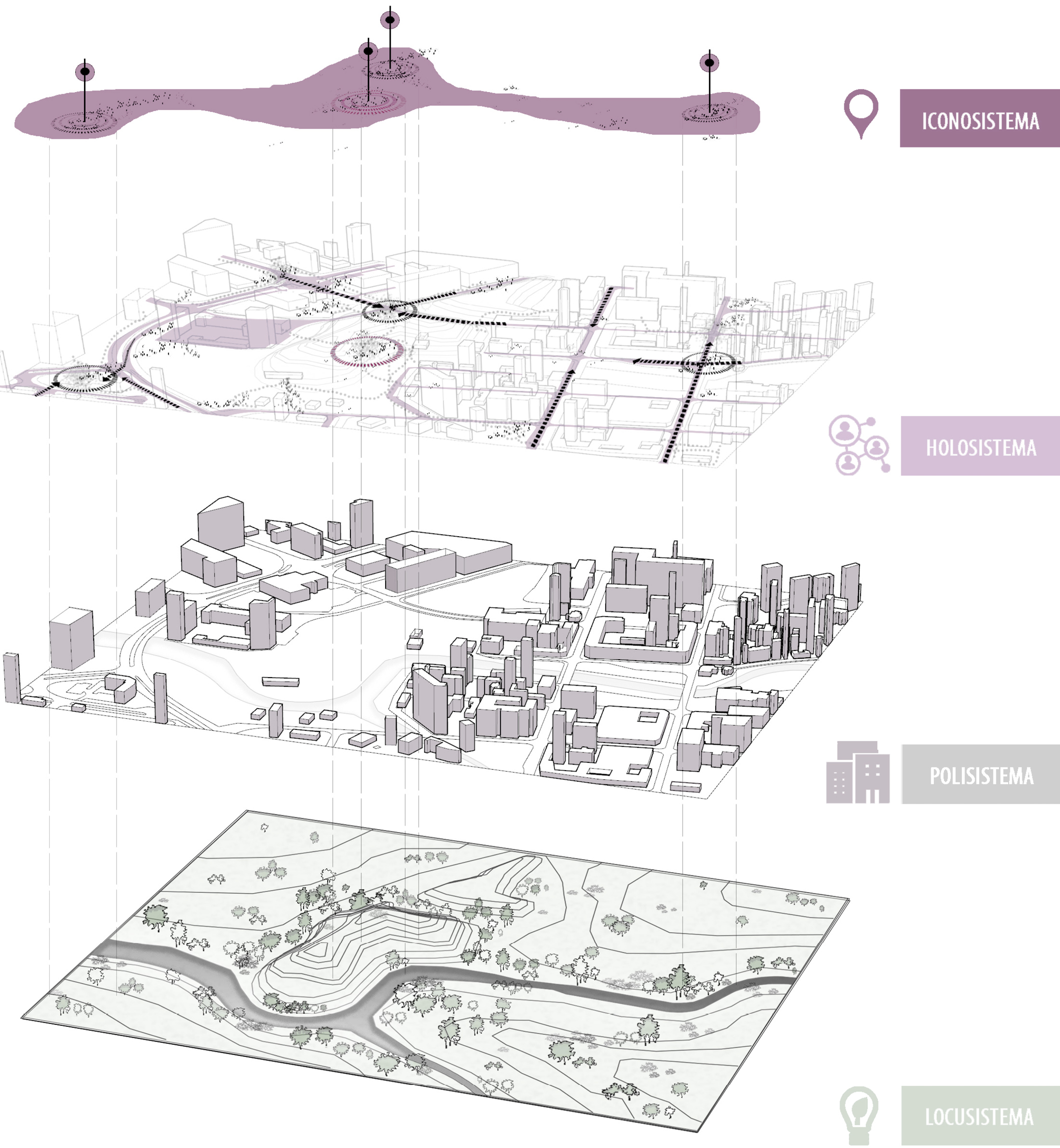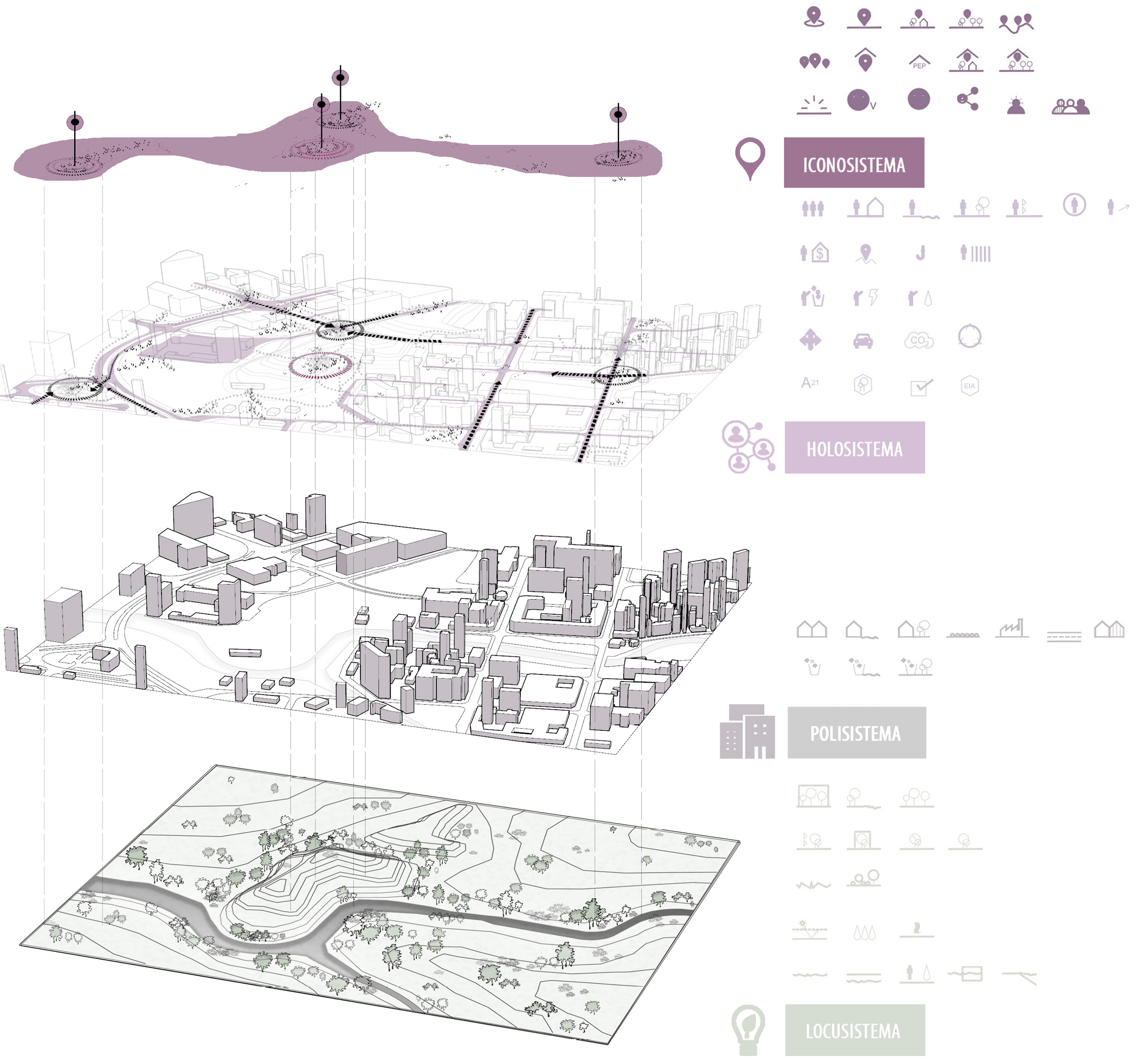 En primer lugar, el locusistema engloba a los sistemas naturales y la biodiversidad; por lo tanto, será el encargado de velar por la dimensión ambiental del territorio, en constante intercambio entre lo natural y lo artificial, protegiendo sus recursos naturales y mitigando el impacto contaminante. Por otro lado, el polisistema se encarga de la configuración y distribución arquitectónica apoyada en el territorio definiendo la relación de interdependencia que existe entre lo natural y lo construido, además de valorar cómo éste impacta en el locusistema. Además, el holosistema recoge las dinámicas funcionales que se suceden en el polisistema contribuyendo a la capacidad de carga sostenible del territorio. Por último, el iconosistema es el encargado de evidenciar los elementos simbólicos y significativos que actúan como representantes de la expresión cultural de una sociedad determinada. Así, el nuevo modelo territorial sostenible se define mediante la relación de sistemas inclusivos (figura 1), integradores e interdependientes cuyas relaciones entreveradas concurren en el territorio actual basándose en sus llenos (polisistema), en sus vacíos (locusistema) y en las relaciones que de estos se derivan (holosistema) para unirlos y dotar de una condición única al territorio donde lo cultural (iconosistema) emerge.