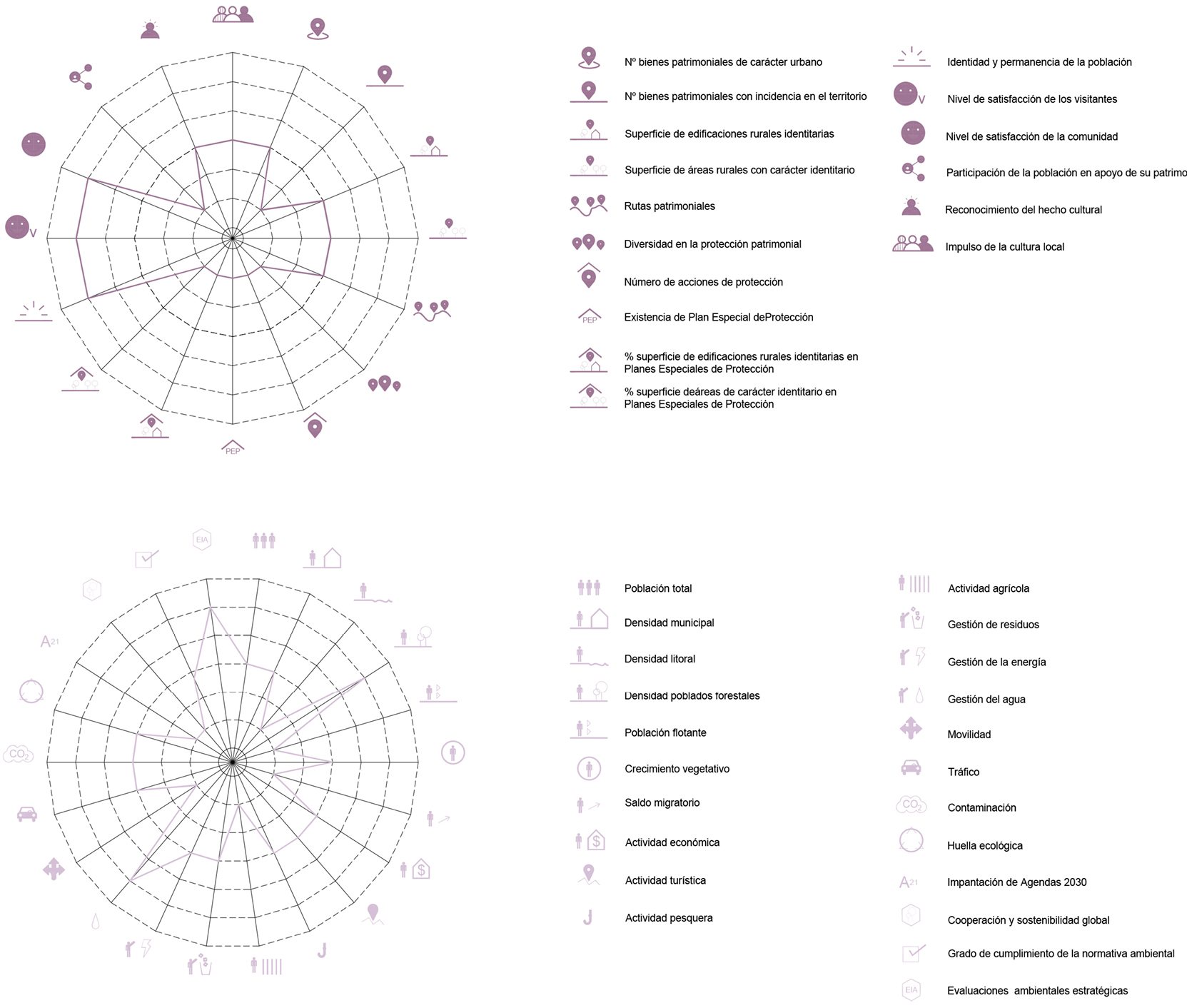 A partir de todas las metodologías y sistemas de indicadores analizados se presenta una propuesta integradora de todas ellas para ofrecer un instrumento metodológico de acción que permita evaluar las dimensiones de los conflictos actuales y proponer soluciones abiertas para abordar el nuevo modelo territorial sostenible deseado. Para ello, se extraen 65 indicadores que se organizan en los cuatro sistemas definidos – locusistema, polisistema, holosistema e iconosistema – como se ve a continuación (figura 2):