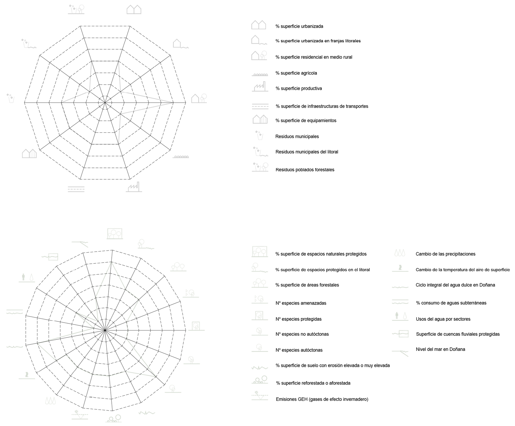 Si realizamos una mirada holística de la sostenibilidad del caso de estudio, prestando atención al diagrama total (figura 4), se puede extraer que, a pesar de lo descrito con anterioridad, existen variables como la clasificación de las especies, el consumo de aguas subterráneas, la urbanización de la franja litoral, las extensiones de terreno destinadas a la producción agrícola, además de la población flotante durante los meses de verano en las urbanizaciones costeras y el refuerzo del cumplimiento de la normativa sostenible que deben ser mejoradas para que el sistema alcance la consonancia suprema deseada. Asimismo, se deben incorporar estrategias que favorezcan la dimensión cultural del caso de estudio para hacer visible su riqueza identitaria construida y natural para, con ello, impulsar la mejora del iconosistema y que el equilibrio sostenible sea alcanzado de un modo totalizador en Doñana.