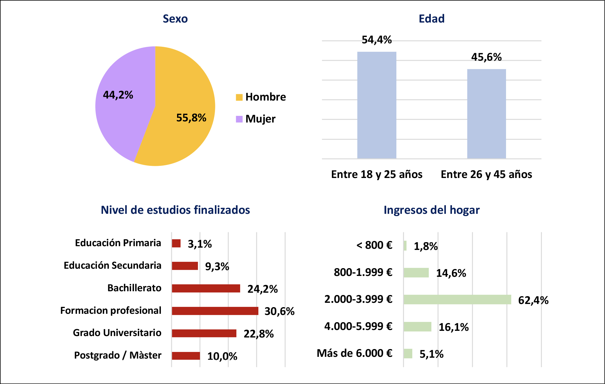 El perfil de los encuestados que constituyen la muestra se compone de un 55,8% de mujeres y un 44,2% de hombres. Las edades se distribuyen entre personas de 18 a 25 años, pertenecientes a la generación Z o centennials (54,4%), y las de que tienen entre 26 y 45 años o de la generación Y o millennials (45,6%). El 10% de los participantes manifiesta haber finalizado estudios de postgrado universitario, el 22,8% estudios de grado, el 30,6% formación profesional, el 24,2% bachillerato, el 9,3% educación secundaria y el 3,1% educación primaria. La gran mayoría de los jóvenes que participaron en el estudio (62,4%) reconocieron unos ingresos mensuales en el hogar situados entre los 2.000 y 3.999 euros (figura 1).