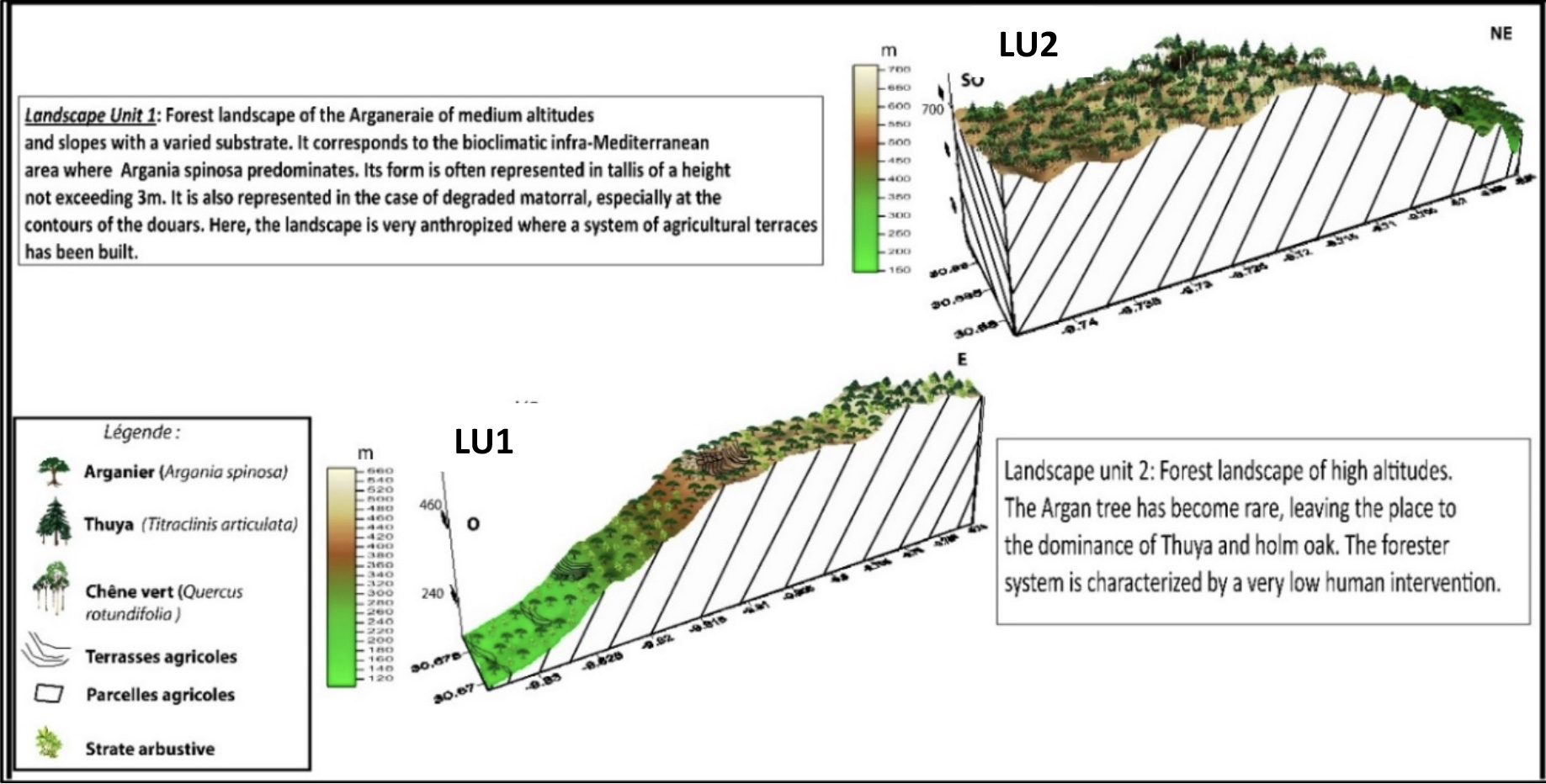 The study of forest landscape dynamics has captured the attention of numerous researchers across various disciplines, including biogeographers, ecologists, economists, foresters, and planners. Each of these researchers brings unique perspectives and objectives to their study, leading to diverse approaches, purposes, and outcomes. They interested in understanding the distribution patterns of species within forest landscapes and how they are influenced by environmental factors such as climate and topography. Also, they may study forest dynamics to assess the economic value of forest resources, including timber production, carbon sequestration, recreational opportunities, forest management practices, biodiversity conservation, and ecosystem resilience. Those diverse scientific approaches lead us to a deeper understanding of the functioning and dynamics of forest landscapes. The study of the natural regeneration of some ligneous species and “relationships between agricultural practices and forest recovery in arid and semi-arid zones are poorly documented” (Genin et al. (2017). Some studies in the Cedar zone of Morocco highlighted the interest in the stationary conditions that influence the natural regeneration of Cedrus atlantica in the Moroccan Atas mountains (Ezzahiri & Belghazi, 2000). In the lower valley of Wadi Tamri, the argan forest presents a landscape of matorral quite degraded and essentially consisting of the association of stands of Argania spinosa and Euphorbea beaumierana distributed on the altitudes between 10m and 600m and Tetraclinis articulate associated with Genista tricuspidata and Lavandula dentata beyond 600m. These species are exploited under traditional use agro-sylvo-pastoral, including overgrazing, firewood, systematic harvesting of argan nuts, clearing and cultivation of undergrowth to create space for agricultural activities such as crop cultivation (cereal crops), pasture establishment, or orchard planting, etc. The degradation of this forest landscape and the difficulty of natural regeneration seem to result from human pressure on the space and the severity of the natural conditions. “The past and present regression of argan forests, in terms of density and total area, is mainly due to desertification, population pressure, pastoral activities, and the overexploitation of forest resources by the local population.” (McGregor et al., 2009).
