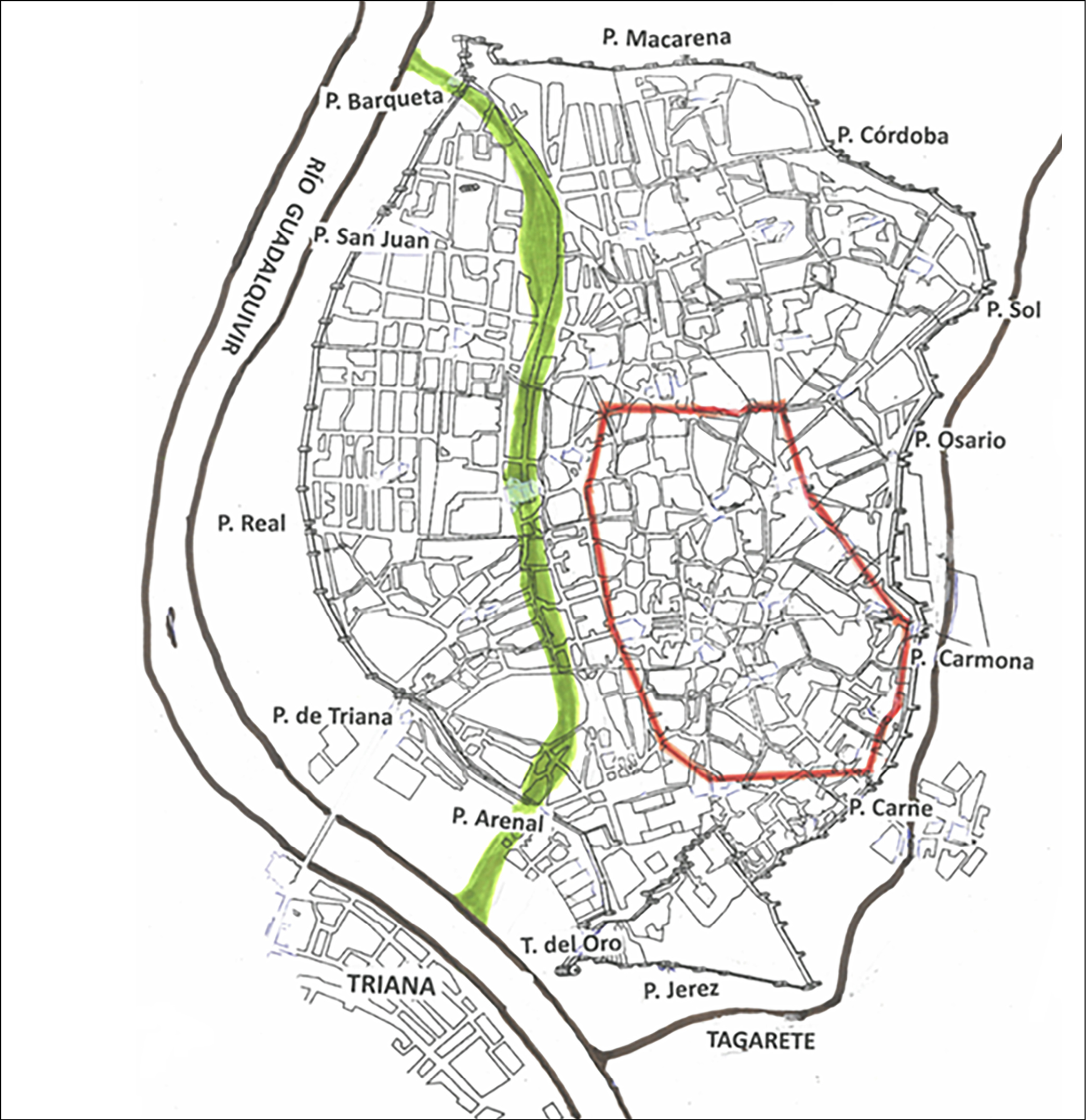 Figura 1. Plano de Sevilla, con indicación de las puertas de la muralla, el perímetro de la ciudad romana, en rojo, y el antiguo cauce, en verde. Fuente: elaboración propia a partir de fuentes documentales.