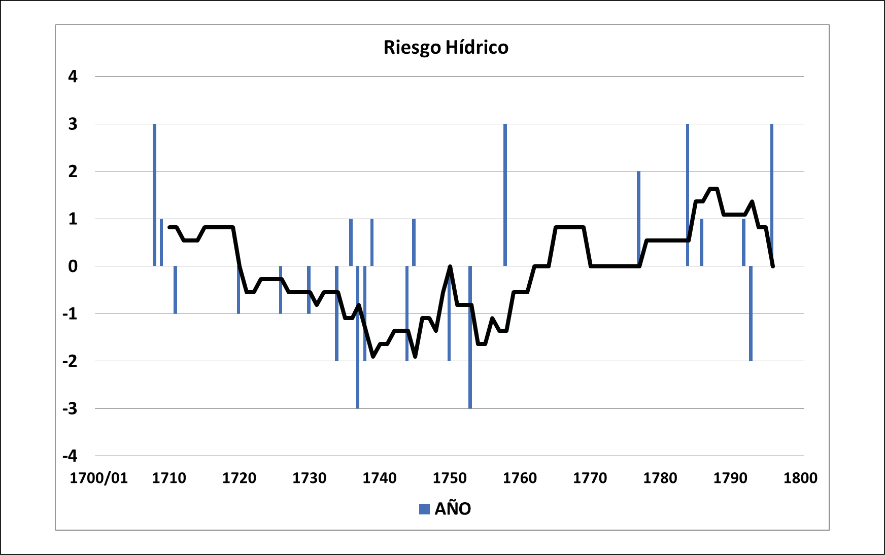 Barriendos (2007) muestra pulsos de sequías frecuentes y severas en los decenios de 1730 y 1750 en Sevilla, y pulsos inversos de lluvias duraderas, extendido al conjunto de la vertiente atlántica, durante las primeras décadas y, muy pronunciada, en las dos últimas décadas del siglo XVIII. También Rodrigo (2007) destaca desviaciones pluviométricas negativas en la primera mitad del siglo, y desviaciones positivas en el último tercio. Por tanto, estos resultados de distintos investigadores y metodologías son concordantes con los establecidos en este artículo mediante el índice de riesgo hídrico RH.
