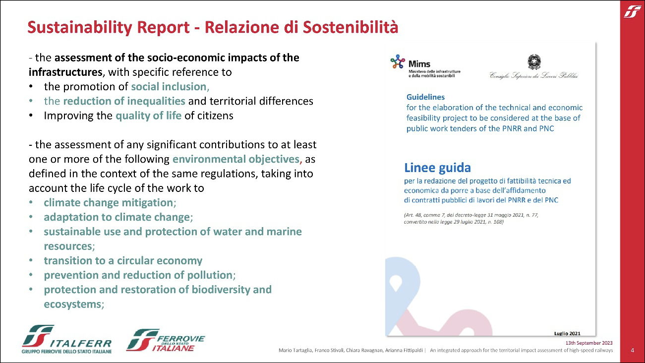 Tartaglia, M., Stivali, F., Ravagnon, C., & Fittipaldi, A. (2023). An integrated approach for the territorial impact assessment of high-speed railways. In 3rd International Workshop on High-Speed Rail Socioeconomic Impacts, 13 sept. FS. https://www.fsitaliane.it/content/dam/fsitaliane/Documents/centro-studi/attivit%C3%A0/Italferr_UIC_HSR_13sett23.pdf.