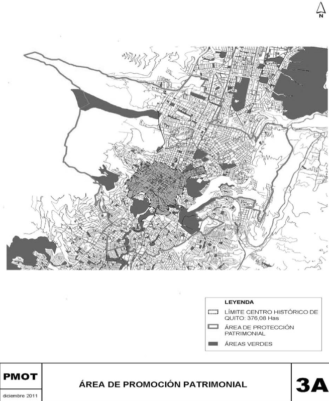 Actualmente, el Centro Histórico comprende más de 370 hectáreas de protección edificada y más de 230 hectáreas de protección natural (figura 3). El anillo edificado está formado por dos zonas: el núcleo central ocupado por el barrio González Suárez y el AdA formada por 14 barrios en los que predomina el tejido residencial. Este relevante legado doméstico ameritó diversos análisis desde fines del siglo XX, aunque sólo muy recientemente se han focalizado propuestas con énfasis en los usuarios, a través de desarrollos específicos del IMP (Sánchez & Woolfson, 2016, 31).