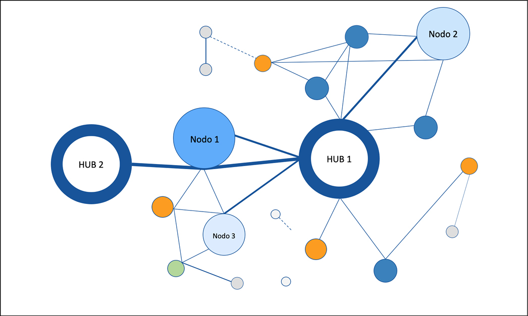 Figura 1. Red espacial y jerarquizada de un sistema regional de nodos de transporte.