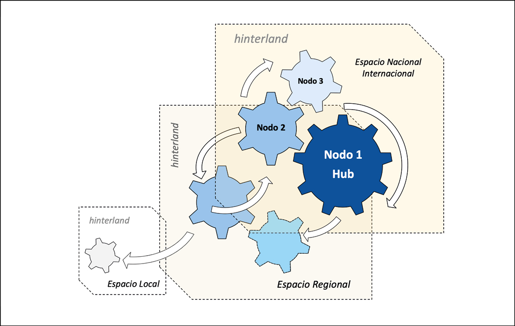 Las infraestructuras consumen territorio y le agregan valor, incluso en amplias zonas casi inertes. En consecuencia, son unidades físicas que facilitan y favorecen la conexión entre las piezas de un territorio (sea cual sea su escala) a modo de hub que recibe, almacena, discrimina, clasifica, organiza, intercambia, procesa y distribuye a otros de categoría idéntica, inferior o superior (figura 3). La intermodalidad adquiere un papel protagonista determinante. En la literatura geográfica y económica corresponde a regiones o sistemas regionales complejos (Vallega, 1995) con el arbitrio de centros operacionales complejos que actúan de gateway (figura 4). Podemos afirmar que se trata de un núcleo de movilidad perenemente activo y oscilante, desempeñando el rol que le reserva el sistema en cada momento histórico, adquiriendo o perdiendo rango y orden.