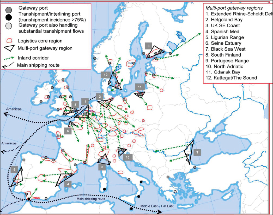 Figura 7. Redes, gateways y corredores regionales europeos de transporte marítimo.