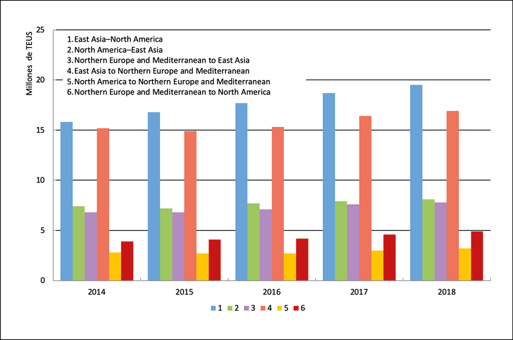 Figura 8. Comercio mundial de contenedores y sus principales rutas marítimas 2014-2018.