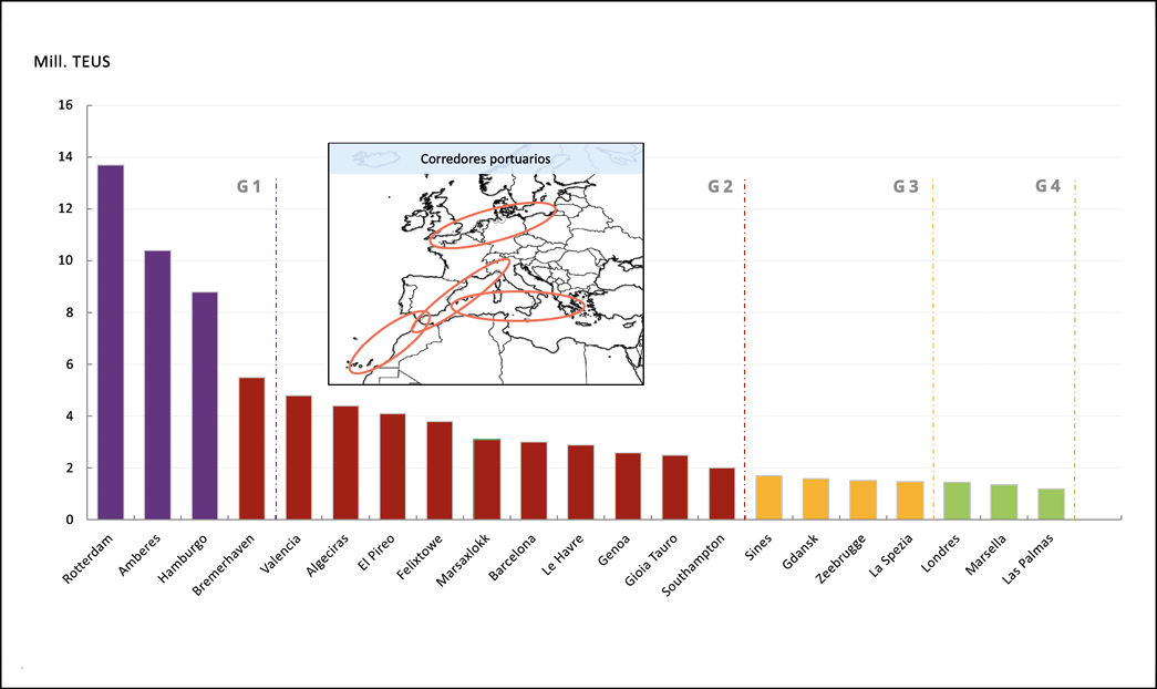 Figura 9. Tráfico de TEU en los diferentes ejes marítimos europeos.