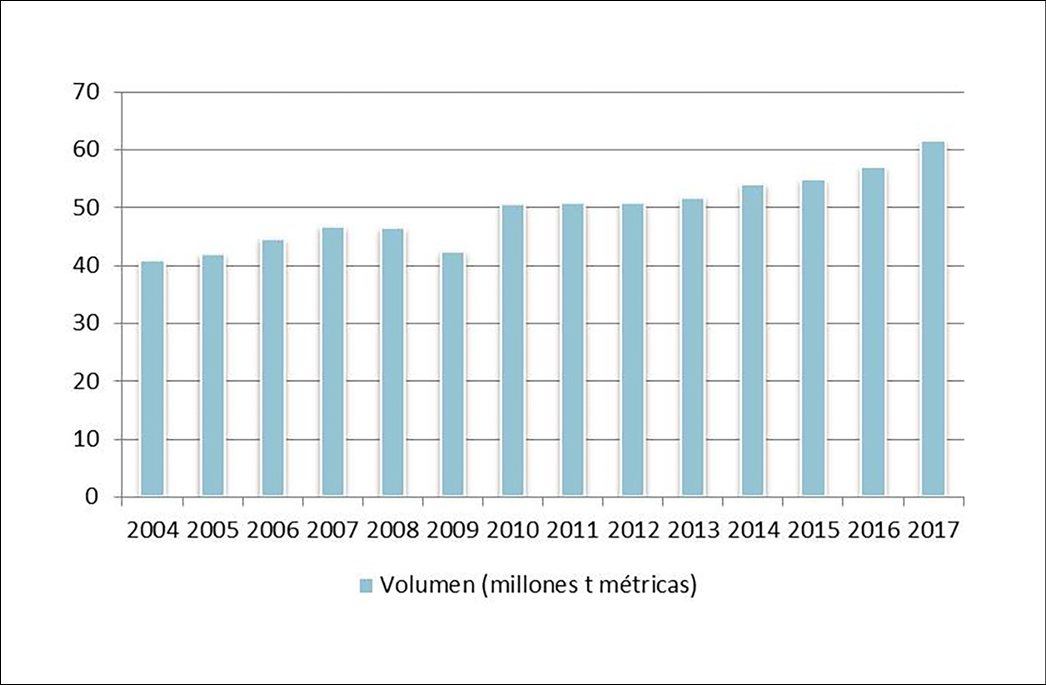 Como se ha comentado en el apartado anterior, el transporte aéreo de mercancías supone un modo minoritario sobre el volumen total de la carga transportada en el mundo, si bien su valor económico hace que sea un modo estratégico. El volumen de mercancías transportadas por avión muestra un incremento constante durante los últimos años (figura 1) aunque ralentizado desde 2011 por el exiguo crecimiento del comercio mundial, pero con previsiones que apuntan a un crecimiento medio anual del 4,2% (Boeing, 2017). En 2016 se transportaron por vía aérea un total de 54.932.000 t, un 4,4% más que el año anterior (IATA, 2017). Este crecimiento va a conllevar importantes efectos sobre la industria aeronáutica, como el aumento previsto del número de aviones de carga en torno al 70% durante los próximos veinte años, ayudado por el empuje del comercio electrónico (Boeing, 2017), pero también en las terminales aeroportuarias y en las zonas de actividades logísticas asociadas (Verhetsel, A. et al., 2015).