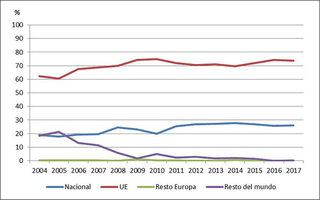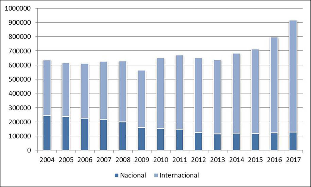 Figura 9. Evolución del tráfico por orígenes/destinos de Vitoria-Gasteiz, 2004-2017.