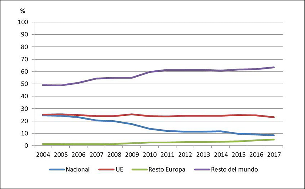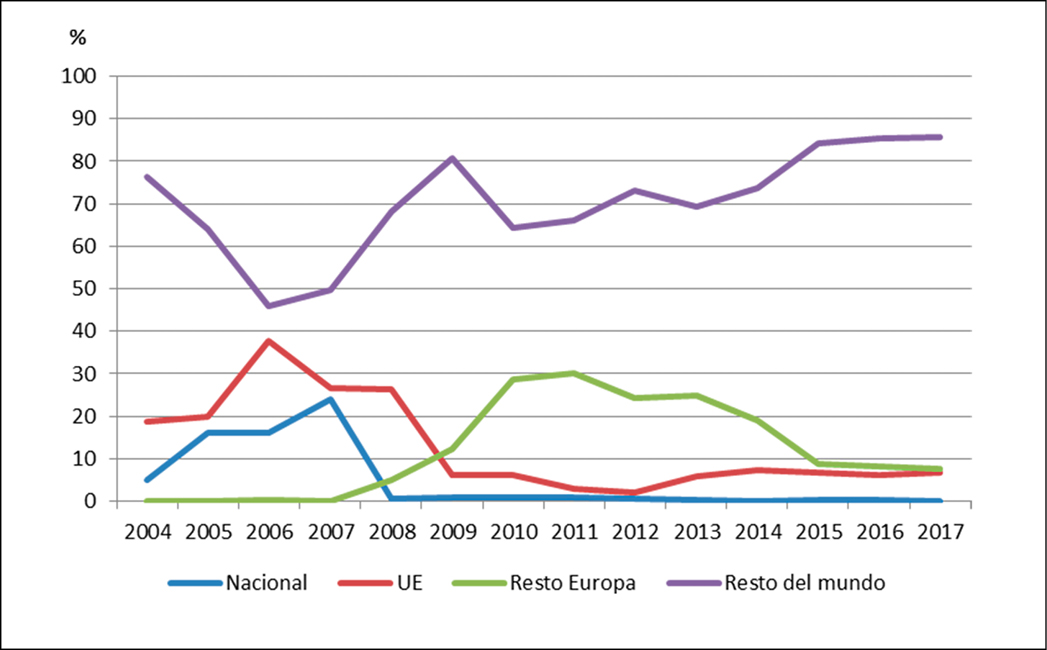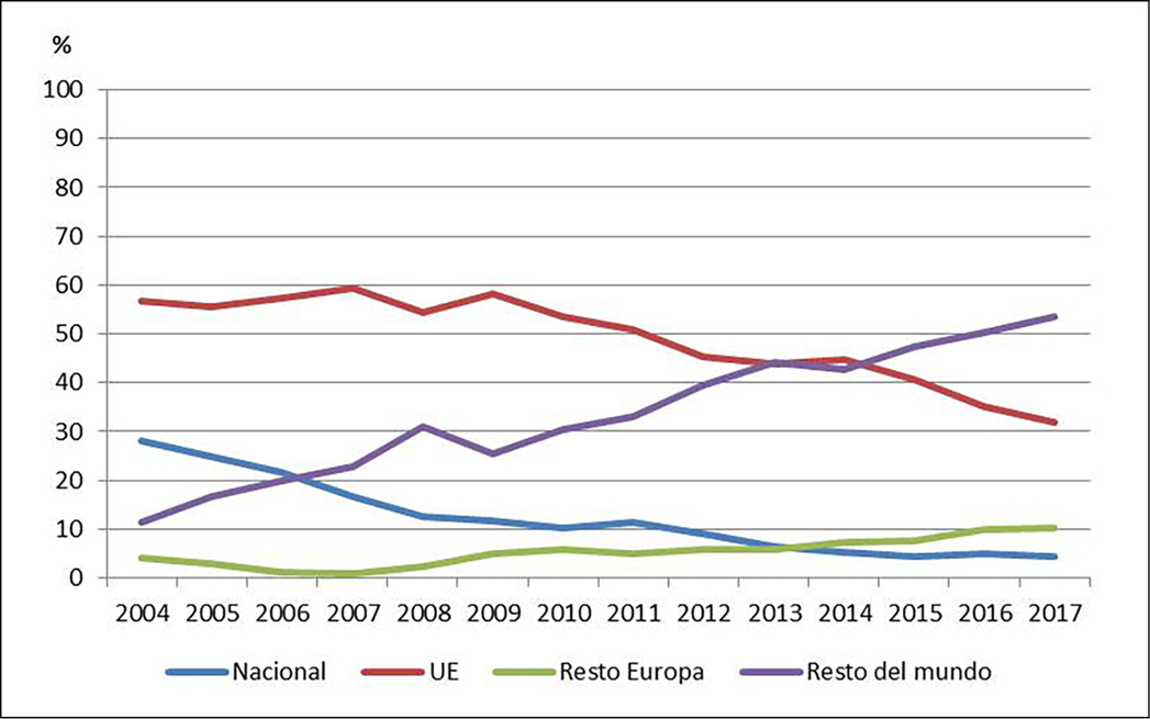 Figura 7. Evolución del tráfico por orígenes/destinos de Barcelona-El Prat, 2004-2017.