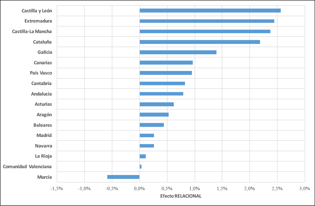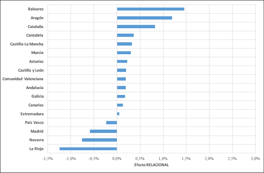1. Un componente relacional, que puede calcularse como la diferencia entre el efecto nacional registrado bruto y el efecto nacional ponderado por vecindad. Ese componente podría considerarse como el efecto relativo, positivo o negativo, que la región recibe como consecuencia de su posición dentro de la red de relaciones, interacciones e intercambios interregionales, y estaría reflejando, al menos parcialmente, los efectos que sobre el crecimiento tiene “la capacidad de la región para crecer en virtud de recursos provenientes de otras regiones - growth spillovers” (Capello y Fratesi, 2016, 301).
