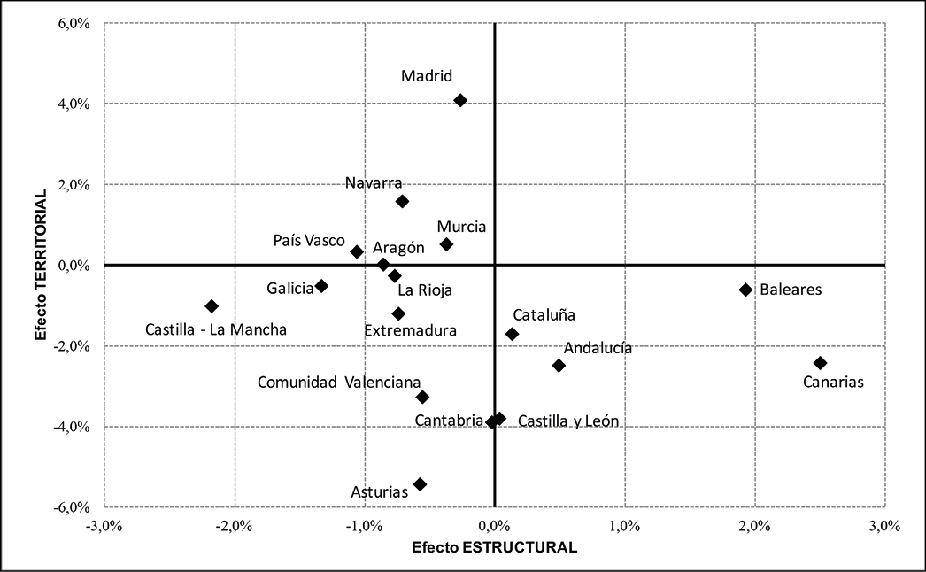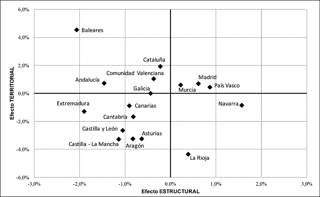 La presencia y fortalecimiento de economías de localización, que intuimos a partir de la evolución de la especialización productiva en determinadas regiones, debería reflejarse en un componente territorial del crecimiento superior y creciente. Este es el caso de las dos regiones insulares y del conjunto de las comunidades del litoral mediterráneo, desde Cataluña a Andalucía. Fuera de este ámbito solo Galicia y el País Vasco muestran una dinámica claramente positiva. Si a estas comunidades añadimos Madrid, –que reduce la magnitud de su componente diferencial territorial, pero lo mantiene en valores positivos–, reunimos a todas las comunidades autónomas que están liderando el crecimiento español en esta fase de recuperación. En estos casos, los procesos de creciente localización y aglomeración de la actividad económica afectan fundamentalmente al sector servicios, –tanto los servicios a la producción como los ligados a la actividad turística–, y a la industria, y el componente territorial, además de verse favorecido por la presencia de economías de localización, estaría también reflejando otros elementos de carácter más específico y propio de cada trayectoria regional pero entre los que probablemente, la presencia de economías de urbanización debe jugar un papel central. Por el contrario, y a pesar de mostrar algunos procesos de creciente localización de algunos sectores económicos (especialmente en agricultura y en industria), el conjunto de las regiones del interior peninsular– incluido el valle del Ebro– y del arco atlántico (Asturias y Cantabria), estarían mostrando un menor dinamismo en la salida de la crisis.