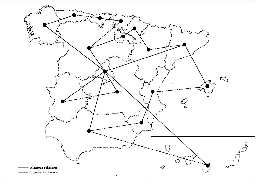 muestra la interacción de la región r con la región s y puede considerase como un indicador del grado de proximidad o vecindad existente entre ambas. Se empleará la matriz de viajes por razones profesionales entre comunidades autónomas de residencia y de destino publicada por el Ministerio de Fomento como parte de la encuesta MOVILIA de 2007 (Mapa 1). El valor de este flujo entre dos comunidades autónomas puede considerarse como una aproximación genérica y suficiente a la interacción económica, mejor que otras alternativas como la matriz de viajes por turismo o, incluso, la matriz de intercambios comerciales, que ofrecen una visión del fenómeno más parcial y limitada.