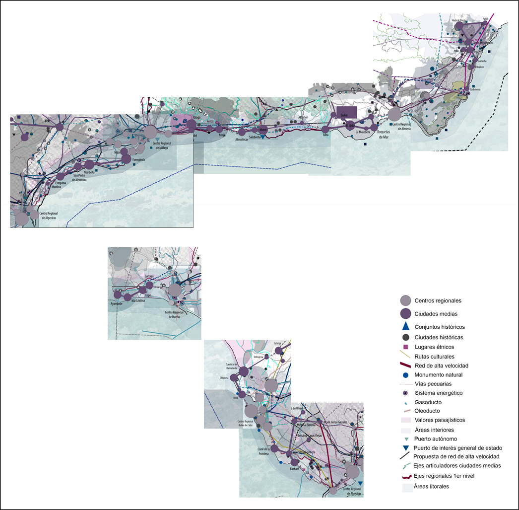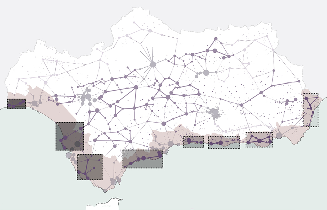 No obstante, ha sido en el litoral “donde se han sumado los procesos de crecimiento urbano [… ya que] presentan una fuerte especialización funcional (turismo y nuevas agriculturas)” (Junta de Andalucía, 2006, 28-56). De esta manera, la costa andaluza conforma ocho redes policéntricas de ciudades medias que comparten funciones y aparecen, dentro del paisaje andaluz como elementos estructuradores del mediterráneo (Sánchez, L. M., 2016; Rodríguez, F. et al., 2016) y del atlántico (ver Figura 2).