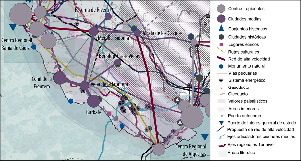 Esta última opción, apoyada en los planteamientos de De Gracia (1992) es la preferida para la contextualización de la metodología planteada en el municipio de estudio debido a las capacidades que la complejidad territorial ofrece en relación a la reinterpretación de un entorno natural protegido, la recuperación de un entorno degradado tras la desindustrialización ubicado en un lugar excepcional de la costa gaditana y la incorporación del municipio como centro de intersección de redes de transporte de primer nivel debido a su posición idónea dentro de la región andaluza.