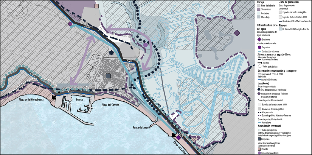 a.Reestablecer la relación perdida entre la ciudad y el territorio. En primer lugar, se detecta la relevancia que el río Barbate ha tenido como elemento estructurador de la actividad productiva de La Chanca, por tanto, la consideración del Parque Natural de La Breña y Marismas del Barbate como un elemento fundamental en la organización y articulación de la vida cotidiana de los ciudadanos de este sector de Barbate, favorece el contacto directo de los mismos con los elementos naturales de su entorno. Con el fin de reestablecer la identidad perdida entre la ciudad y su territorio y, además, favorecer el vínculo inmediato con el territorio y el paisaje que éste regala al área de estudio, se propone un entramado de paseos, plazas, jardines y calles peatonales producto de la reutilización de los espacios industriales intersticiales que fomentan la permeabilidad y la relación inmediata con el entorno de la propuesta, recuperando la relación perdida del núcleo urbano con el río y la marisma. Asimismo, para que esta conexión traspase la barrera de lo visual y se transforme en tangible se propone la apertura de un nuevo sistema viario que facilite la comunicación interna de todo el ámbito, de éste con el resto del municipio, y, además, con el resto del territorio andaluz reforzando el carácter intermediador y articulador de las ciudades medias.