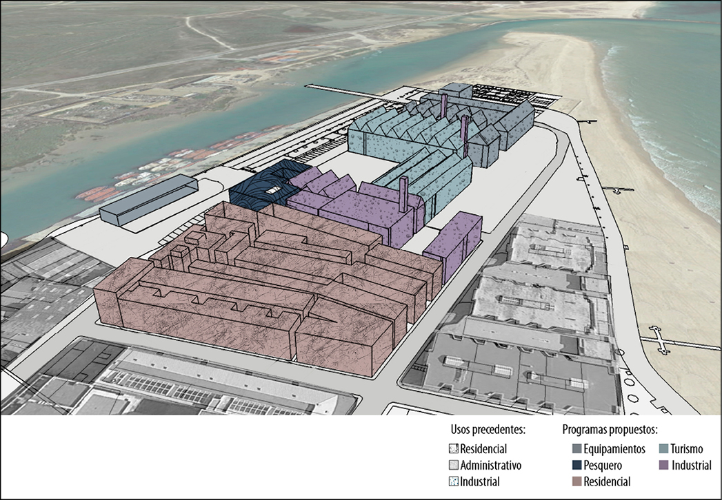 c.Considerar la reconversión programática del caso de estudio a través de usos contemporáneos sensibles con el entorno. El complejo industrial del Consorcio Nacional Almadrabero, formado por la fábrica almadrabera, las viviendas de los trabajadores y la antigua lonja de Barbate, se convierte en un espacio de oportunidad desde el que consolidar usos contemporáneos para recuperar sus estructuras fabriles y, con ello, devolver su seña de identidad originaria al ámbito de estudio.