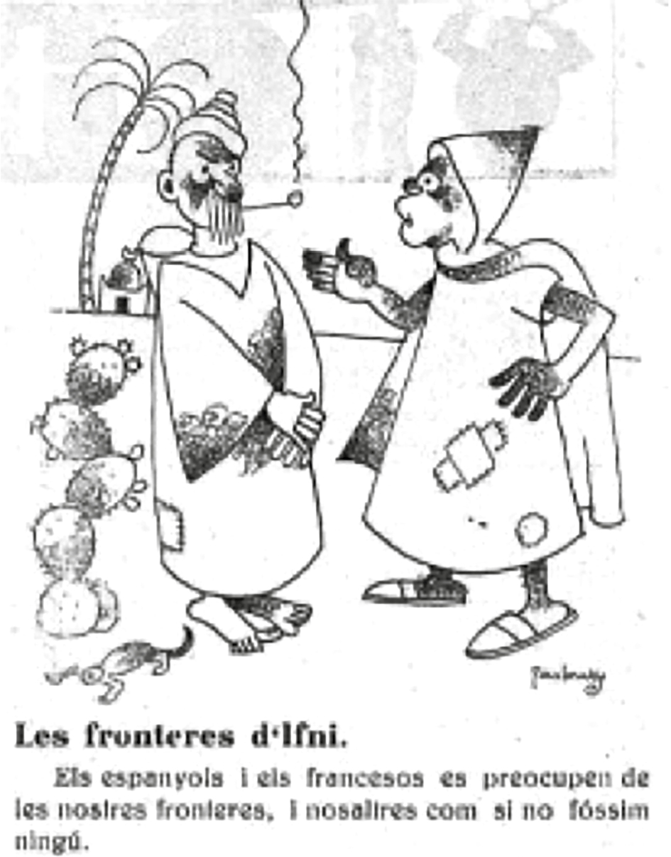 Escrito por el periodista Francesc Madrid, ironizaba sobre las supuestas bondades de Ifni aduciendo a un anónimo africanista. En el mismo artículo, recreaba una entrevista al ministro Ramón Álvarez-Valdés donde explicaba que el objetivo del gobierno de Lerroux era retornar a un imperio similar al de Felipe II durante el siglo XVI. Utilizando el accidente de avión que conllevó la muerte de dos militares, Madrid pone en boca del ministro que “ha sido simplemente una prueba para demostrar que no era simple casualidad el que no hubiera habido más, sino capacidad del coronel del mismo nombre [Capaz] y, por consiguiente, del Gobierno”. El resto de la entrevista alababa la fertilidad de la tierra, la pesca y “las mujeres bellas”. Al final de la publicación narraba un viaje imaginado del mismo Francesc Madrid a Ifni. Allí, entrevistaba al coronel Capaz reiniciando el procedimiento realizado con Álvarez-Valdés, el uso de la ironía para destacar las incongruencias entre las supuestas bondades del territorio y la realidad. Así, por medio de la sátira y de personajes reconocibles por el lector, Francesc Madrid ridiculizaba la ocupación de Ifni y recordaba los aspectos más negativos que se habían conocido, como el accidente aéreo. Sin llegar a decantarse por ninguna opción, El Lliri Blanc inventó bromas ajenas a cualquier clase de crítica (“Les tropes espanyoles han ocupat Ifni”, El Lliri Blanc, 14-04-1934, p. 5; “Més sobre l’ocupació d’Ifni”, El Lliri Blanc, 21-04-1934, p. 3).