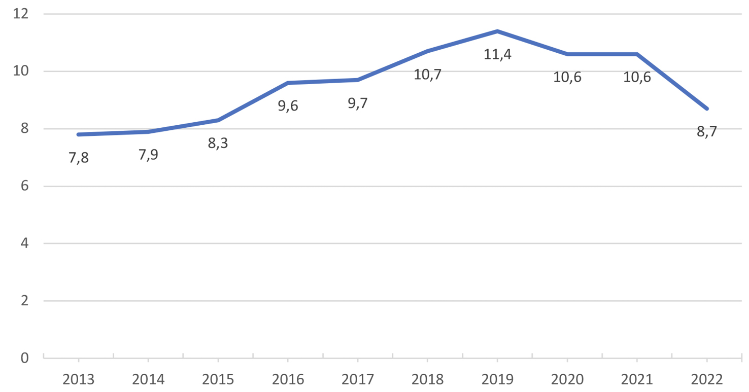 A pesar de este claro predominio del sector privado, lo cierto es que, tal y como puede observarse en el siguiente gráfico, desde el año 2019 se viene observando un claro retroceso de la ratio de colocaciones entre uno y otro. Este cambio de tendencia se ha explicado por un mantenimiento de la cuota de mercado por parte de los servicios públicos de empleo, que, de hecho, ha venido siendo bastante estable en los últimos años, y por la mejora de la situación en el mercado de trabajo[14], de lo que se derivaría que el sector privado vendría a compensar parcialmente la falta de capacidad relativa del público en períodos de alto desempleo, que son los más habituales.