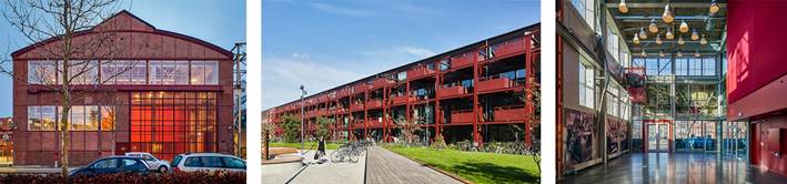 Este planteamiento se aplica en Valby Machinery Halls, proyecto realizado en el año 2018 por el estudio C.F. Møller. La nave a intervenir, Montagehallen, era un taller de montaje del barrio Valby de Copenhague, que en la actualidad se encuentra en un proceso de transformación y regeneración urbana al distrito Valby Maskinfabrik. Está formada por una sucesión de 200 metros de longitud de cerchas en celosía de acero y la simplicidad constructiva original de la nave resuelve las fachadas con un cerramiento de hojas de ladrillo visto entre los pórticos de la estructura metálica.