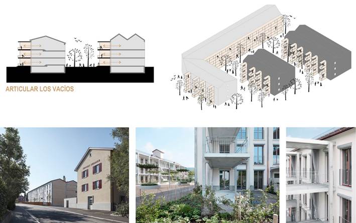 El tercer planteamiento proyectual es la articulación de la nueva urbanización en torno a los edificios preexistentes en el conjunto industrial. En este caso, las tipologías de recintos fabriles con varias volumetrías permiten mantener una parte de ellas y desarrollar nuevas construcciones, enfatizando los ejes originales del conjunto. Generan espacios públicos intermedios, promoviendo una relación armónica entre la memoria industrial y las nuevas viviendas.