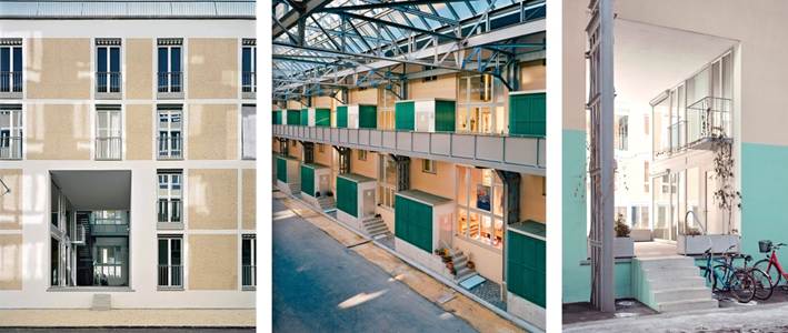 La apertura total de la calle central sin ningún tipo de cubrición también es una de las variantes de la estrategia. Se pone en práctica en proyectos como Freilager Albisrieden, de reutilización de los antiguos almacenes libres de impuestos de Zürich, realizado por Meili, Peter & Partner Architekten. El espacio central de relación acompaña la linealidad de las naves y se abocan a él las nuevas piezas de balcones que sustentan la vida exterior de las unidades residenciales.