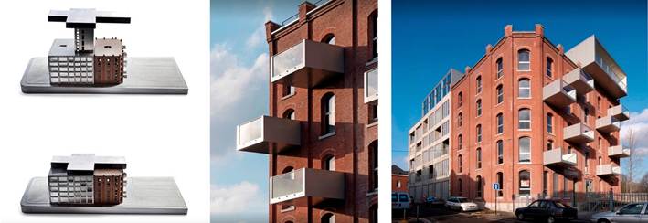 Fig. 07 Proyecto La Minoterie en Roubaix, TANK Architectes, 2008. Maqueta de la inserción de la nueva volumetría en las piezas existentes e imágenes de las fachadas del conjunto. Fuente: Fotografías de TANK Architectes