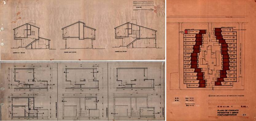 Fig. 2. COVIMT 1, primera cooperativa construida tras la aprobación de la Ley: Cortes (D.0188), Tipologías (D.0303) y Planta General (D.0305) CCU, 1969. Fuente: Departamento de Documentación e Información (DDI), Instituto de Historia (IH), Facultad de Arquitectura, Diseño y Urbanismo (FADU), Universidad de la República (UdelaR).