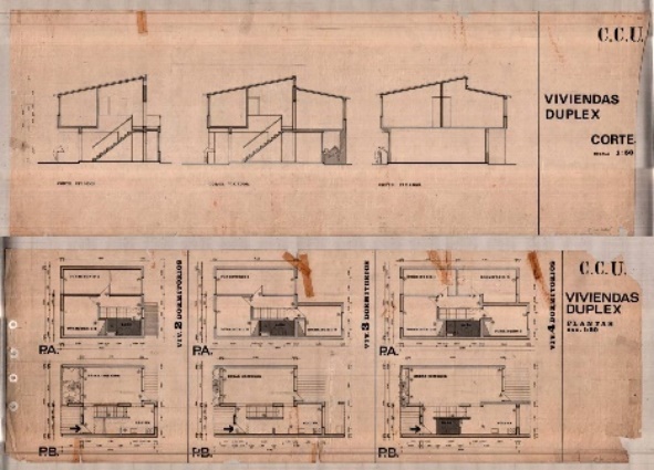 Fig. 6. Conjunto nuevo amanecer: Cortes (D.0188) y Plantas Viviendas Dúplex (D.0186), CCU, 1971-1975. Fuente: DDI, IH, FADU- UdelaR.
