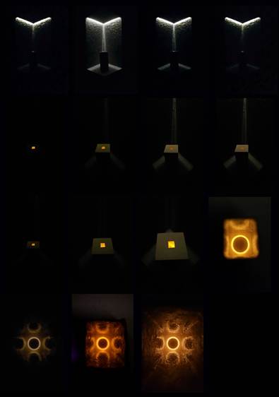 The project begins with students selecting a significant life experience imbued with strong affective content as the foundation for their work. These experiences, chosen for their vivid emotional clarity, anchor an otherwise open-ended brief. Guided by the atmospheric qualities of these memories, students translate them into staged spatial assemblages constructed from Plaster of Paris, and microprocessor-controlled lighting. The aim is to evoke and convey, to an audience, the emotive essence of the experience in a tangible, material, yet atmospheric form (see figure 4).