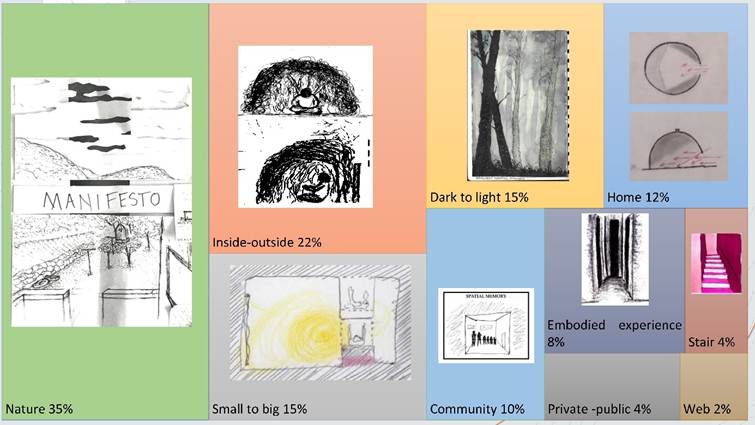 The personal spatial narrative method unearths these dimensions of the designer's place attachment and asks how these are reflective of a particular design voice or way of seeing and being. Students’ personal spatial narrative drawings reflect these places attachment dimensions with 35% of students’ memories reflecting nature bonding, whilst 22% deal with the threshold between the internal, world and the outside natural world. Interestingly 12% reflected home, and 10% were memories involving community and family (refer Figure 5).